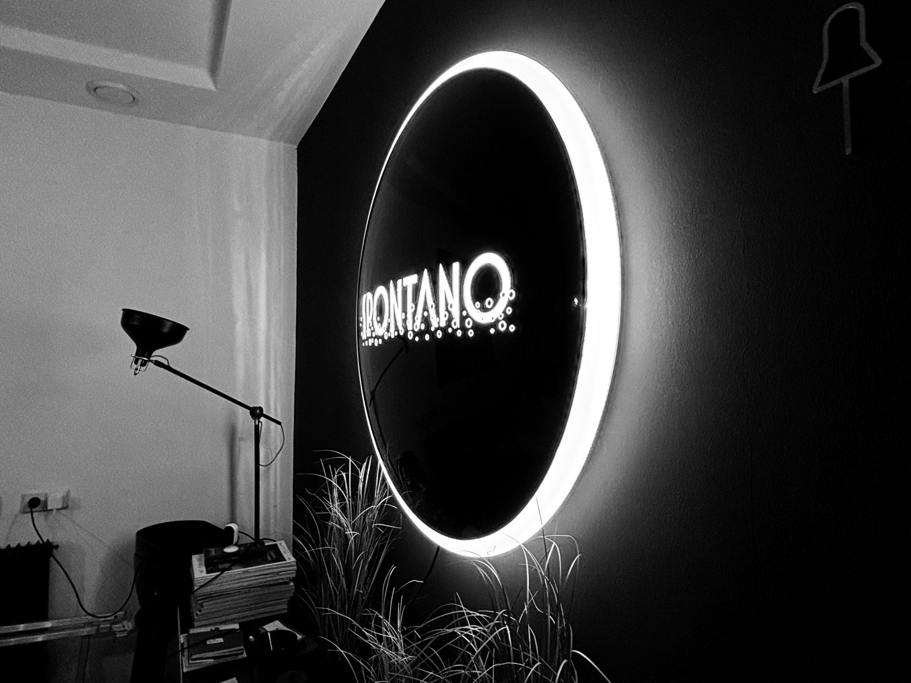 A pezsgőbár központi világító egysége, egy kör alakú, ívelt lámpatest. Közepén a márka logója kapott helyet, így vált a tér meghatározó látványelemévé.